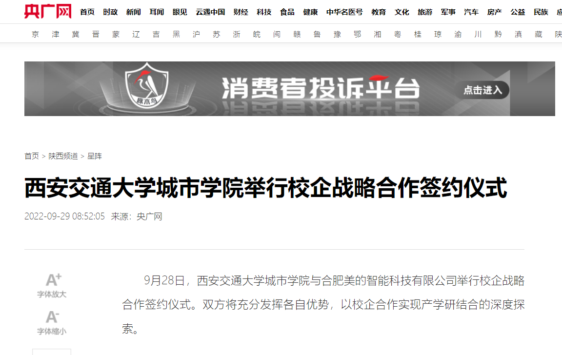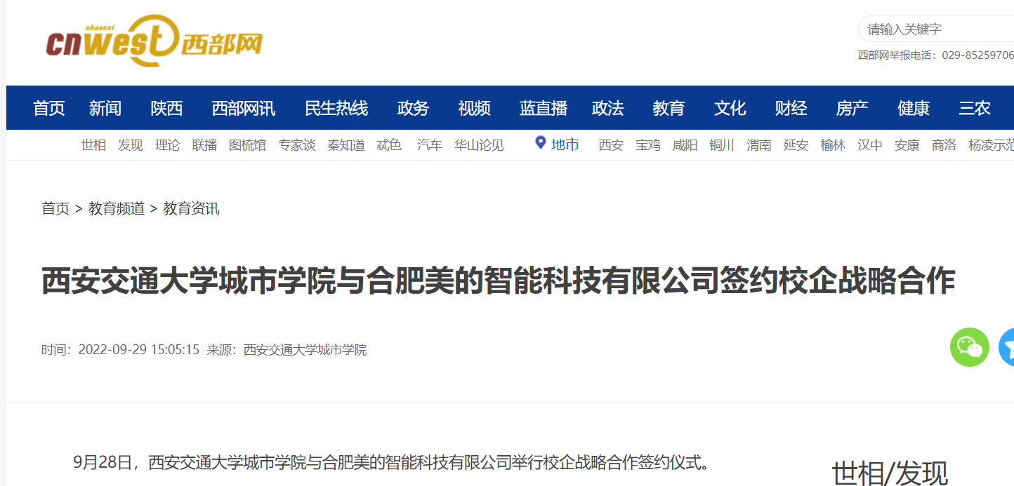 近日,央广网、西部网、华商网、腾讯陕西平台等对学院与合肥美的智能科技有限公司举行校企战略合作签约仪式进行了报道,具体链接如下:
