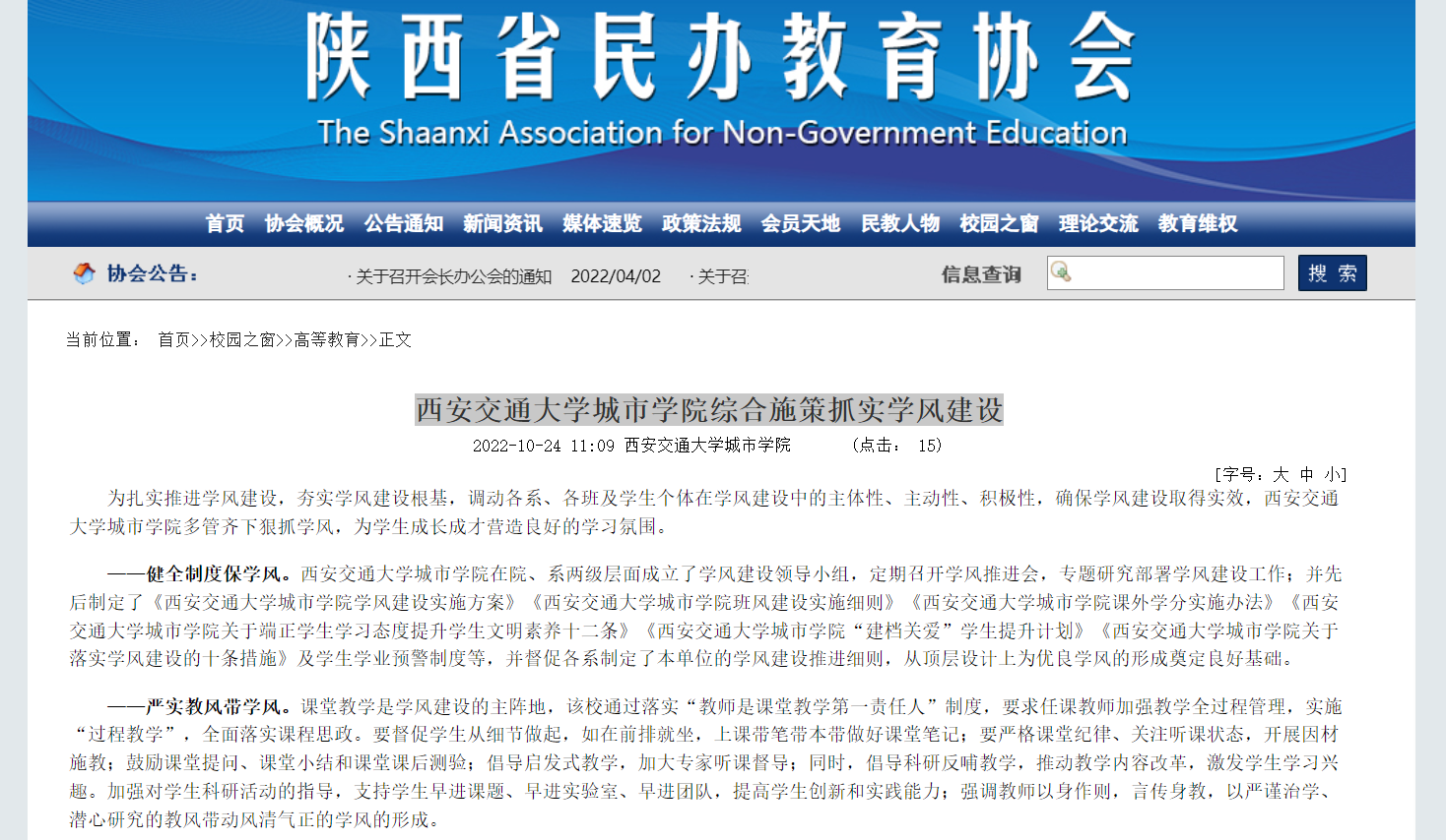 近日,陕西省民办教育协会报道了学院抓学风建设相关内容,具体链接如下: