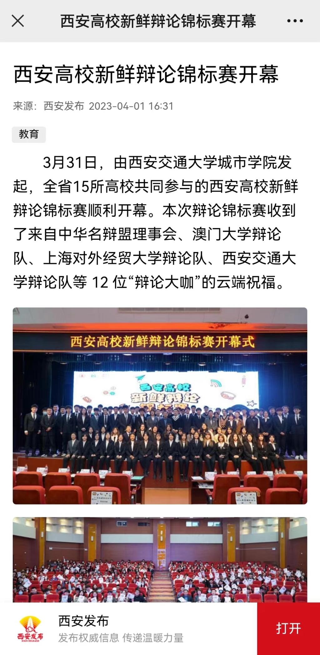 4月1日,西安发布报道了由学院发起,全省15所高校共同参与的西安高校新鲜辩论锦标赛。