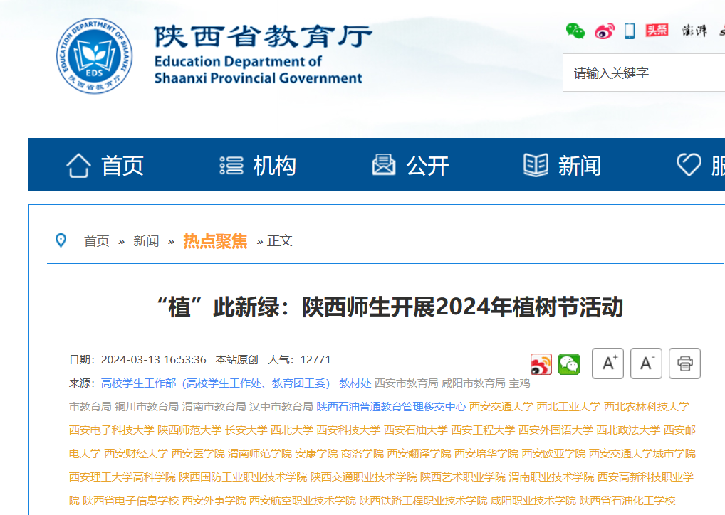 近日,陕西省教育厅报道了我校2024年植树节活动。