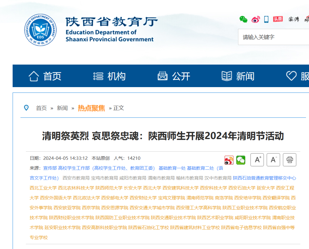 近日,陕西省教育厅报道了学院师生开展2024年清明节活动的内容,具体链接如下: