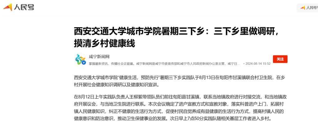 近日,咸宁新闻网人民号对我校暑期社会实践进行了报道,