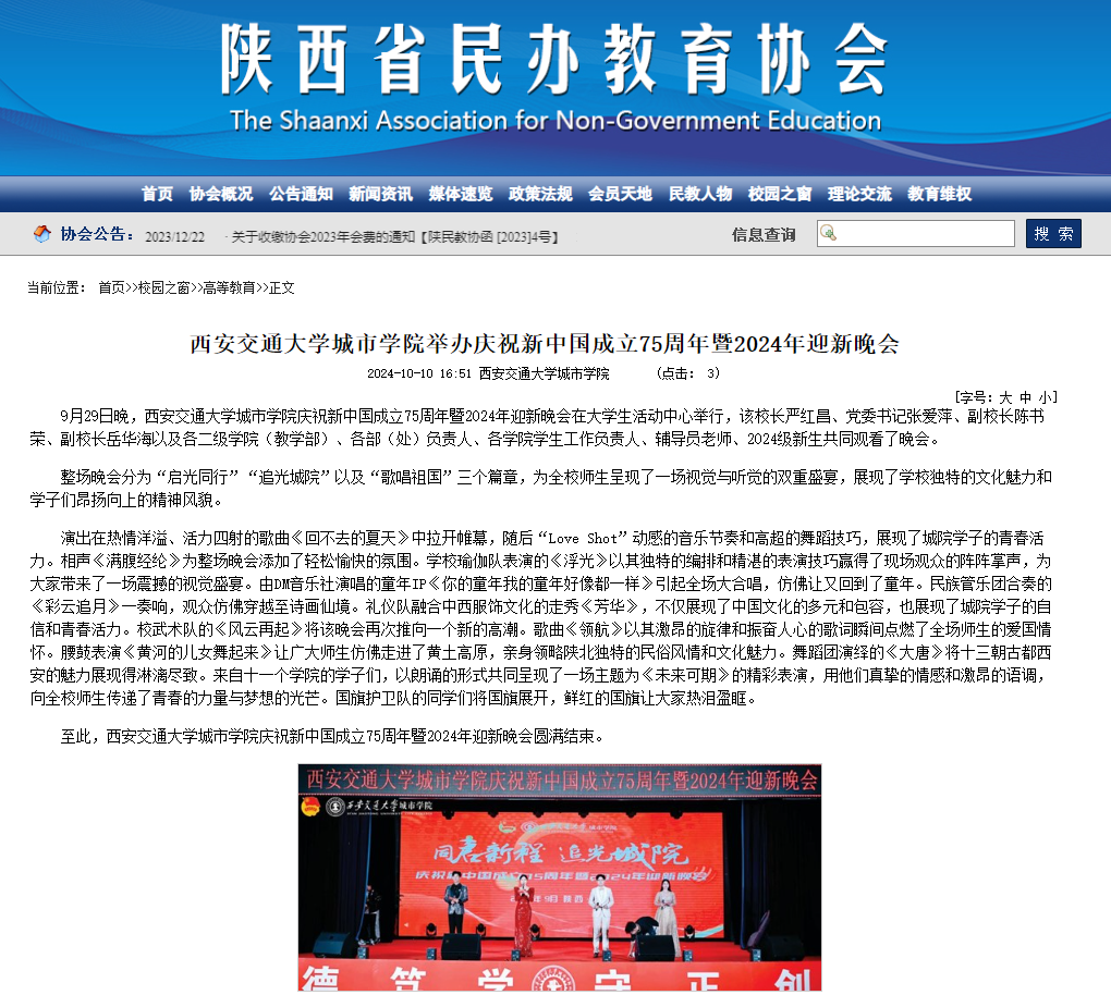 近日,陕西省民办教育协会对学校举办庆祝新中国成立75周年暨2024年迎新晚会进行了报道,具体如下: