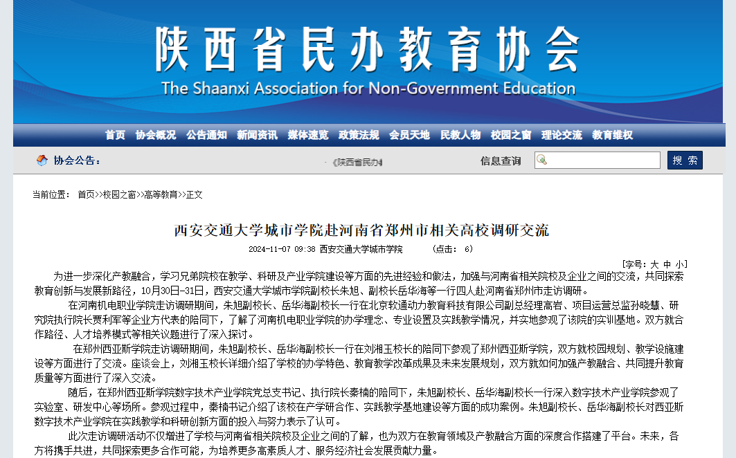 近日,陕西省民办教育协会对我校赴河南省郑州市相关高校调研交流进行了报道,具体如下: