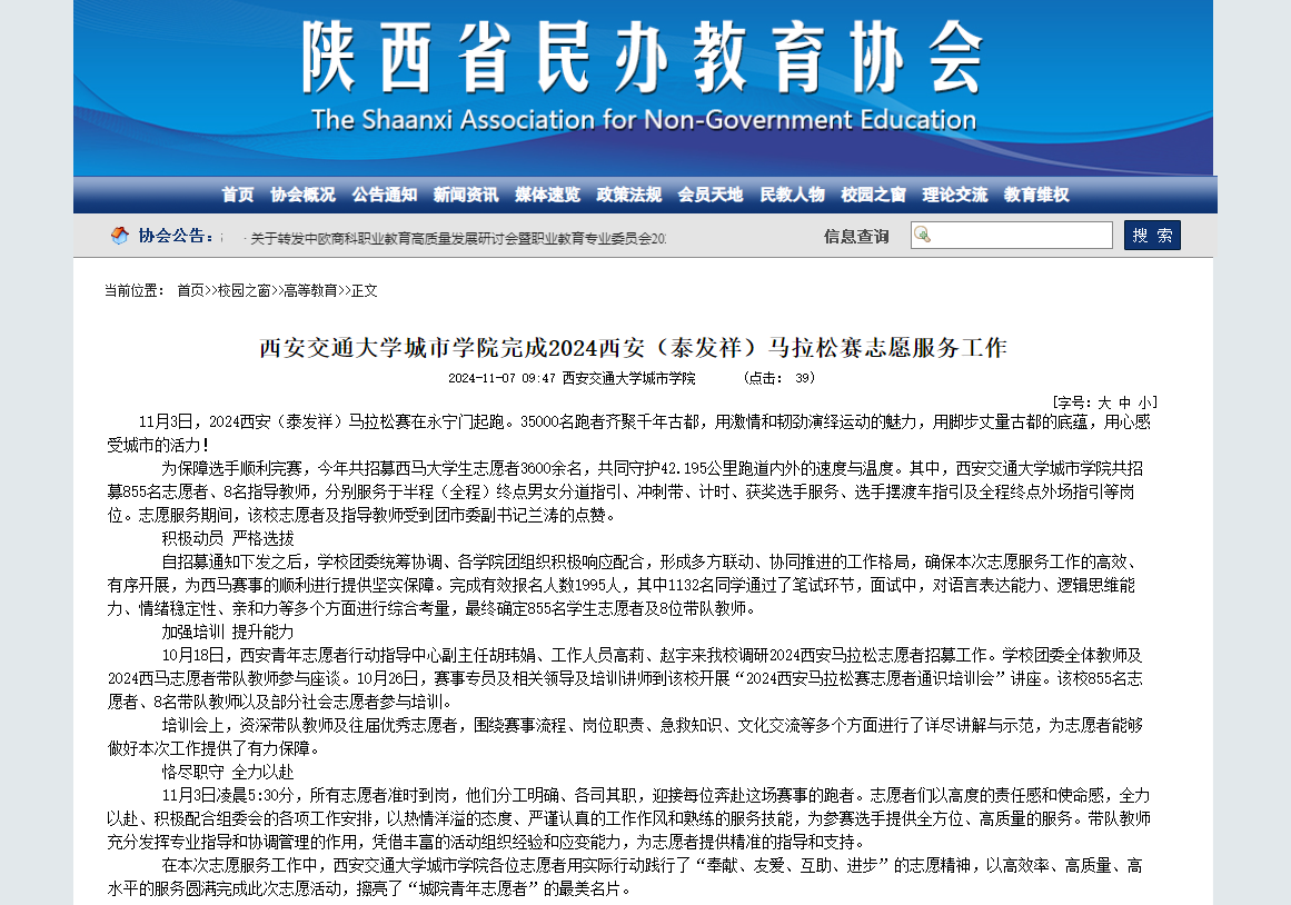 近日,陕西省民办教育协会对我校完成2024西安(泰发祥)马拉松赛志愿服务工作进行了报道,具体如下: