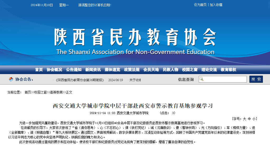 近日,陕西省民办教育协会对我校中层干部赴西安市警示教育基地参观学习进行了报道,具体如下: