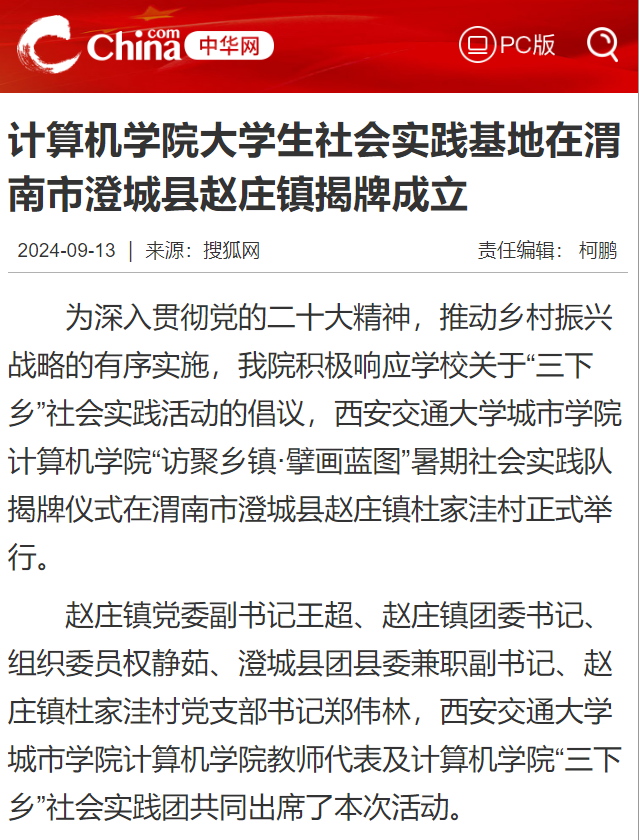 近日,中华网对我校计算机学院大学生社会实践基地在渭南市澄城县赵庄镇揭牌成立进行了报道,具体如下:
