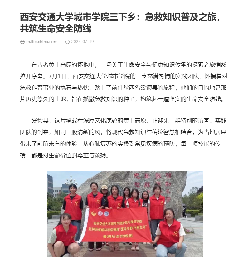 在古老黄土高原的怀抱中,一场关于生命安全与健康知识传承的探索之旅悄然拉开序幕。7月1日,西安交通大学城市学院的一支充满热情的实践团队,怀揣着对急救科普事业的执着与热忱,踏上了前往陕西省绥德县的旅程,他们的目的地是那片历史悠久的土地,旨在播撒急救知识的种子,构筑起一道坚实的生命安全防线。