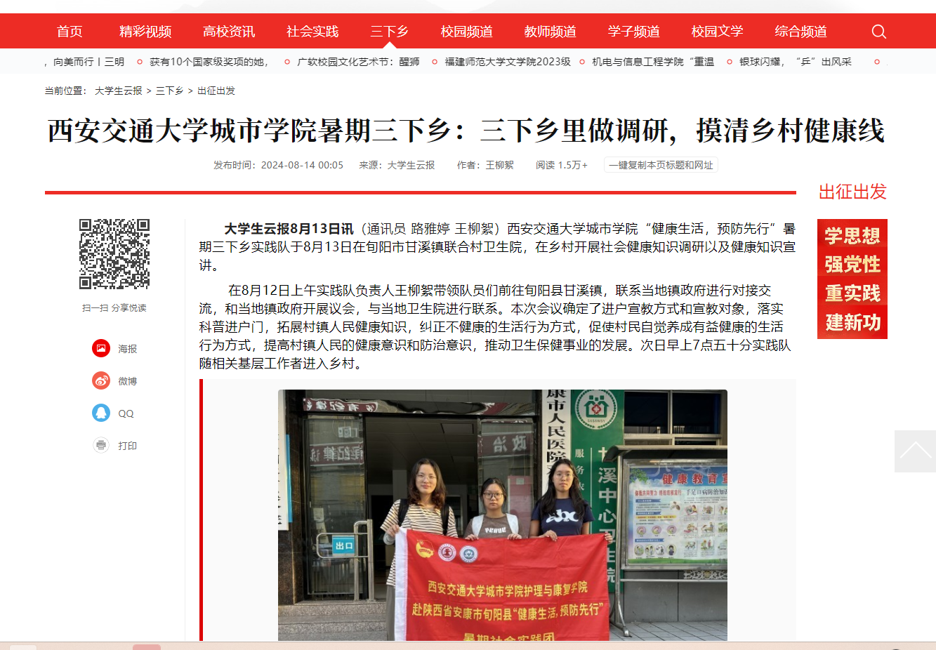 近日,大学生云报对我校暑期三下乡:三下乡里做调研,摸清乡村健康线进行了报道,具体如下: