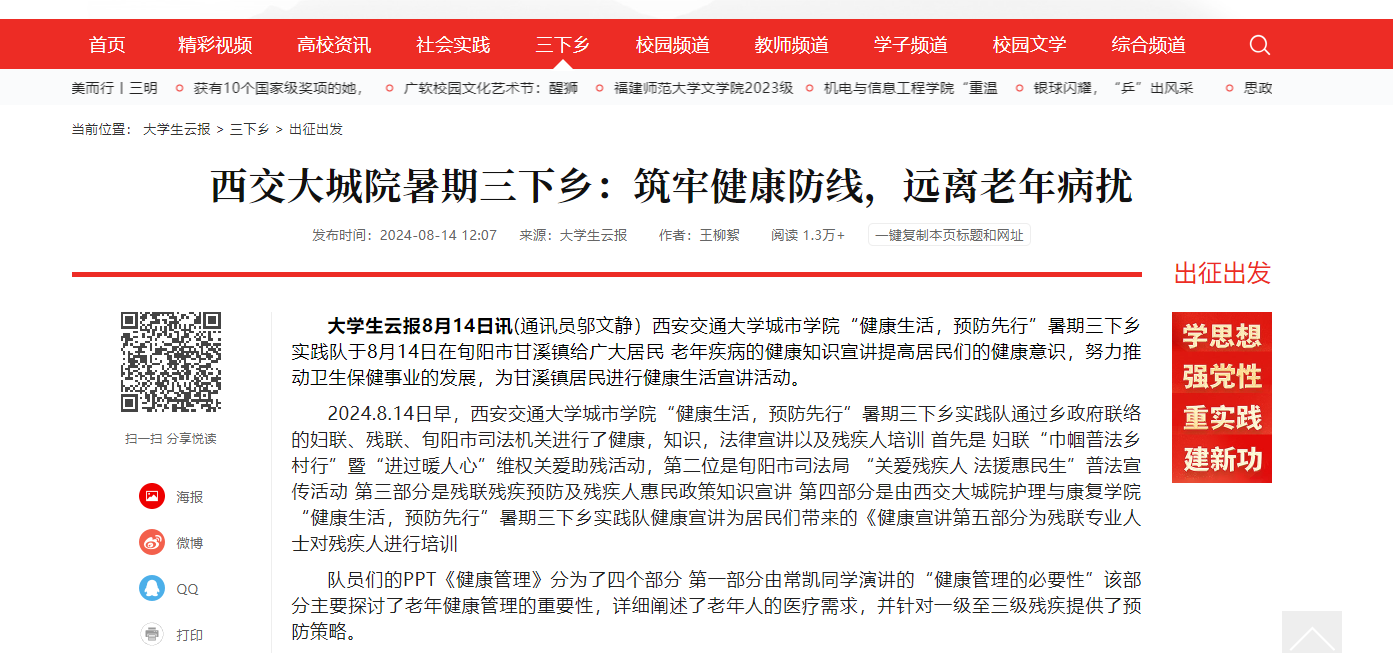 近日,大学生云报对我校暑期三下乡:筑牢健康防线,远离老年病扰进行了报道,具体如下:
