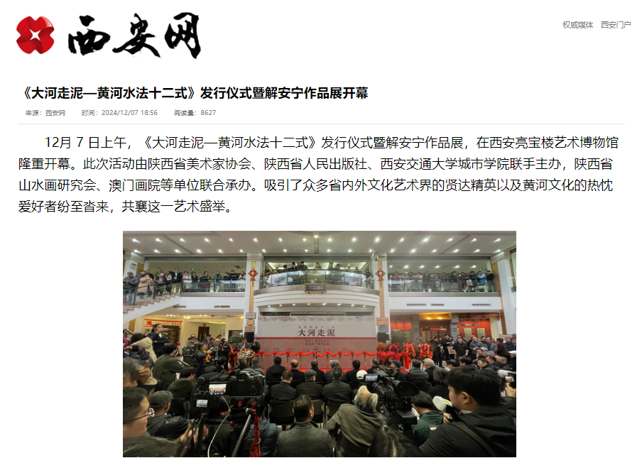 近日,西安网对我校艺术与设计学院院长解安宁《大河走泥—黄河水法十二式》发行仪式暨作品展开幕进行了报道。