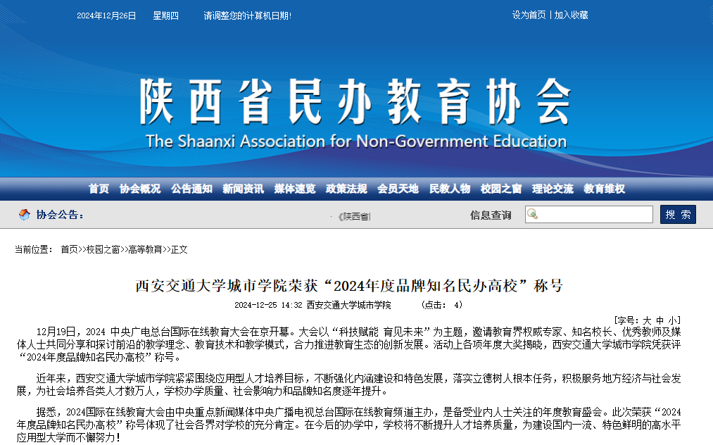 近日,陕西民办教育协会对我校荣获“2024年度品牌知名民办高校”称号进行了报道。