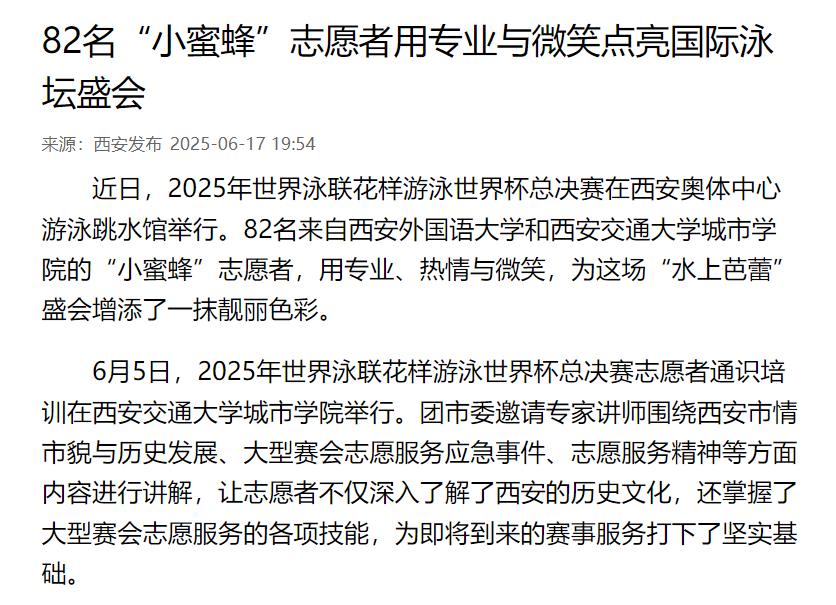 近日,2025年世界泳联花样游泳世界杯总决赛在西安奥体中心游泳跳水馆举行。82名来自西安外国语大学和西安交通大学城市学院的“小蜜蜂”志愿者,用专业、热情与微笑,为这场“水上芭蕾”盛会增添了一抹靓丽色彩。
