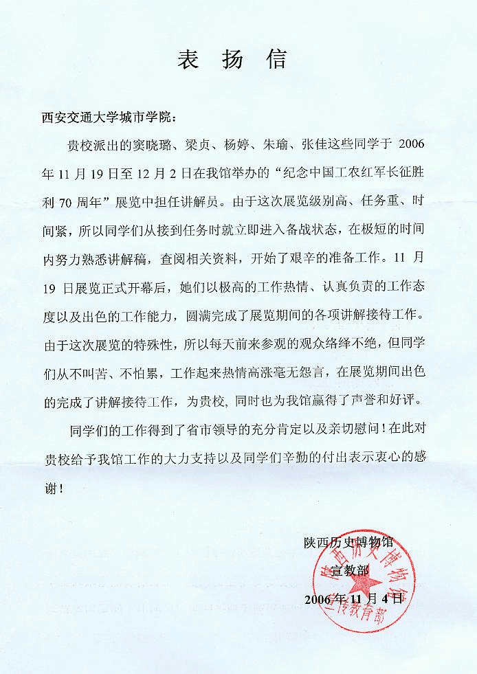 关于通报窦晓璐等5名学生担任陕博“纪念红军长征胜利70周年”展览义务讲解员的表扬信