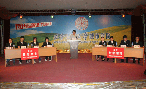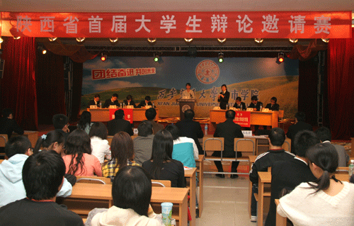 2006年11月4日晚7时,陕西省首届大学生辩论赛初赛第二场在我院大学生活动中心拉开战幕。此场辩论赛是学院辩论队组建以来第一次出战,与实力强大的西北大学辩论队展开激烈的论辩。学院党总支副书记、副院长韩超老师、学生教育及后勤服务中心副主任马兆平老师亲临辩论现场为我院辩论队助阵。