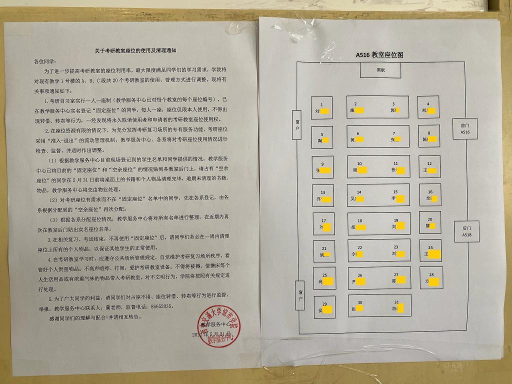 最后,统筹联动,确定固定座位。教学服务中心根据各系上报的2022届毕业生实际考研座位需求个数,按比例将262个空余座位划分给各系,并由各系在尽量满足学生需求下二次分配座位,教学服务中心汇总后公布所有座位实名名单,并已将考研实名座位图对应贴到每个考研教室后门。