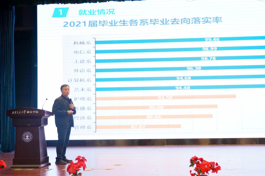 为及时总结我院2021届毕业生就业工作开展情况、表彰先进,推进2022届毕业生就业工作,实现更早、更快、更充分、更高质量就业目标,10月21日,西安交通大学城市学院2021届毕业生就业工作总结会暨2022届毕业生就业工作推进大会在教二报告厅召开。院长陈光德、党委书记张爱萍、副院长张敬朝、副院长朱旭、副院长岳华海、院长助理徐君陶、纪委书记朱普社、工会主席冀祥出席会议,各系主任、分管就业工作系领导、各专业负责人,党政中心、教学中心、招生办公室等相关部门负责人,各系学生工作负责人、2022届毕业班班主任、全体辅导员等人员参加会议。会议由学生中心副主任马瑞主持。