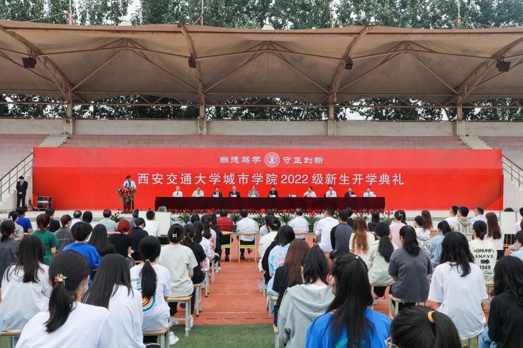恰同学少年,风华正茂。9月17日上午,西安交通大学城市学院在田径运动场举行2022级新生开学典礼。2022级新同学在老师、同学、学长学姐的祝福声中,怀揣梦想,以昂扬奋斗的青春姿态,共同开启城院时光。西安交通大学党委常委、校长助理洪军,西安交通大学社会教育管理处副处长巩稳定,西安交通大学城市学院院长陈光德,党委书记张爱萍,副院长张敬朝,副院长朱旭,副院长岳华海,院长助理张学堂,纪委书记朱普社,工会主席冀祥、教授会主席王海民等出席大会并在主席台就座。大会由路凡同学主持。