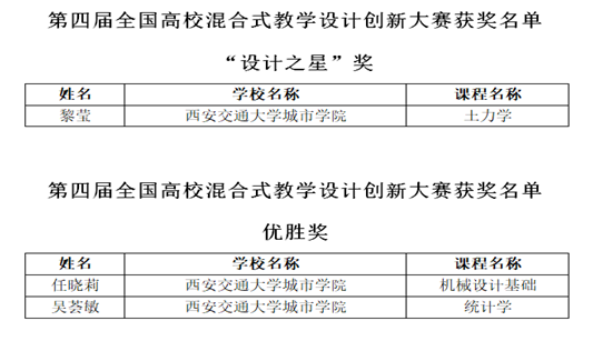 11月27日,由清华大学主办的第四届全国高校混合式教学设计创新大赛总决赛顺利举办,西安交通大学城市学院第一次推选教师参加该项大赛,土建系黎莹主讲的《土力学》获得“设计之星”奖,机械系任晓莉主讲的《机械设计原理》和经济系吴荟敏主讲的《统计学》获得优胜奖。
