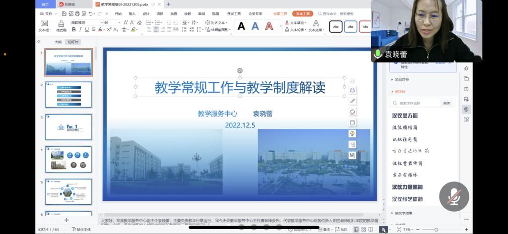 12月5日,教学中心常务副主任袁晓蕾老师精心准备,为新入职教师做了学院教学常规工作和教学制度的解读,内容全面、详尽,覆盖了日常教学管理的各个方面,使教师对学院教学、上课、考试等方面有了更全面、深入的认识。