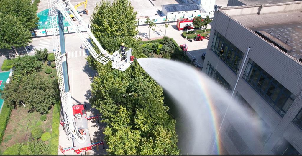 同时,西安经开消防救援大队鸿明路救援站在教学楼D楼开展消防救援安全演习,演习过程中使用云梯消防车对顶层着火点进行扑火,为现场军训团全体师生上演了一堂生动的消防救援实践课。