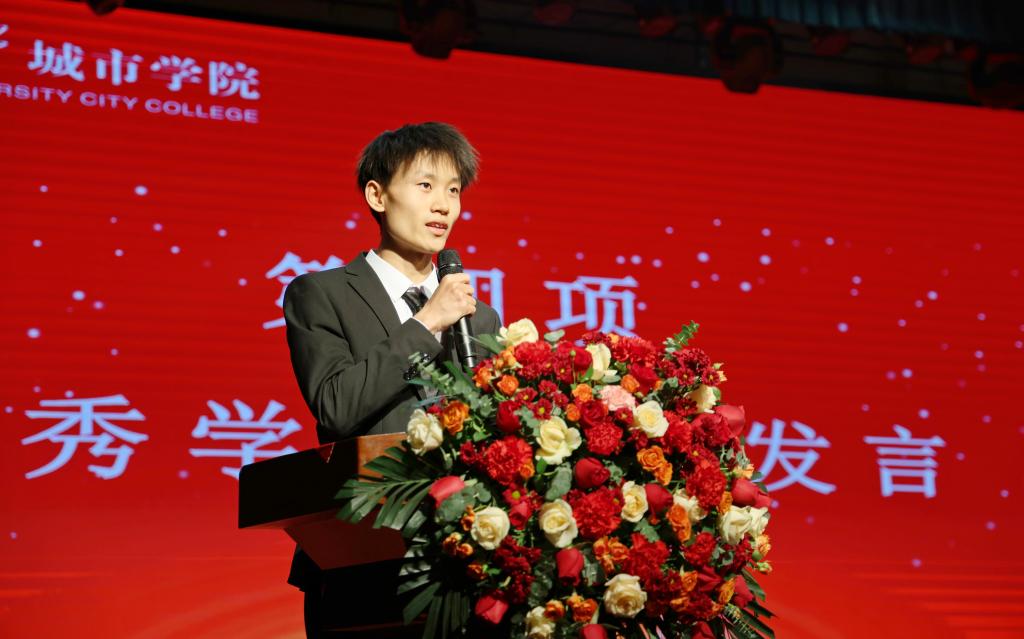 颁奖仪式后,优秀学生标兵获得者毛睿豪作为获奖学生代表发言。他讲述了自己制定目标并为之勤奋追逐的历程,鼓励同学们脚踏实地,不断进步,不断超越,敢于有梦、勇于追梦、勤于圆梦,在时代的巨浪中拼搏奋斗。