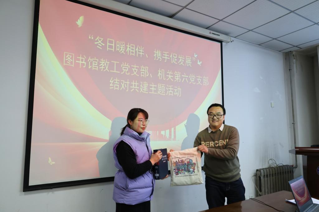 图书馆档案馆联合党支部书记蔡建康介绍了结对共建活动的相关情况。随后,图书馆邵晶馆长从查阅资料、人才引进及绩效管理等方面介绍了图书馆能够为人事相关工作提供的帮助。组织人事处姬志国处长就相关人事制度向图书馆、档案馆同志们进行了介绍说明,重点解读了大家关心的改革后职员职级晋升管理办法。档案馆董凌副馆长介绍了档案馆的工作职能及工作特点。两个支部三个部门的党员也进行了充分的互动交流。接下来,图书馆档案馆联合党支部书记蔡建康与机关第六党支部书记黄迎老师代表支部互赠了礼品。