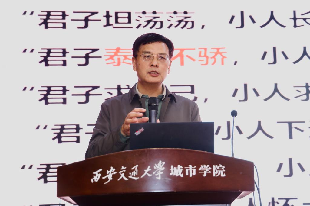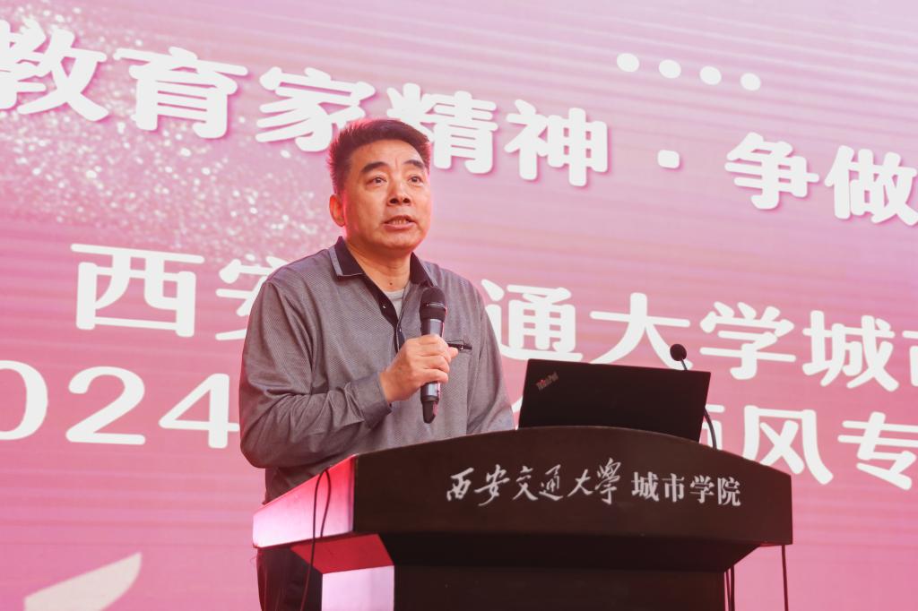 西安交通大学城市学院于10月18日上午在教二报告厅举办“弘扬教育家精神,争做新时代大先生”师德师风专题报告会。思政教学部主任陆卫明教授作专题报告,朱旭副校长主持会议,各二级学院青年教师、实验技术人员及辅导员近200人参会。