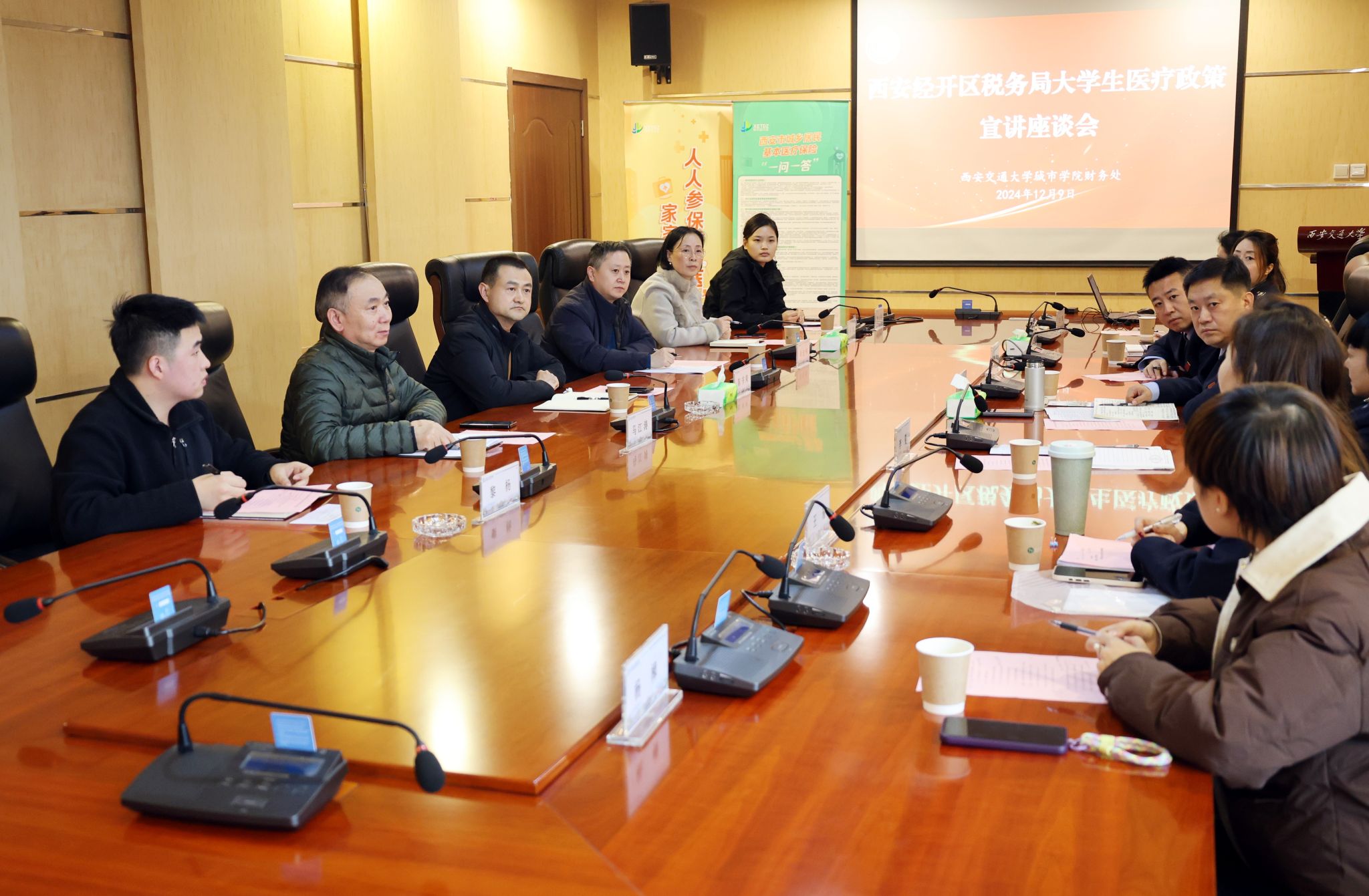 学生工作处处长辛红伟汇报了学校在开展大学生医保工作方面的相关情况。经开区税务局社保非税科王晖与医保中心王瑜分别介绍了经开区税务局关于大学生参保缴费相关情况与大学生医保政策的核心内容,并和大家共同学习了《国家税务总局西安市税务局西安市医疗保障局关于西安市2024年城乡居民基本医疗保险参保缴费的通告》,进一步明确政策导向与工作要求。