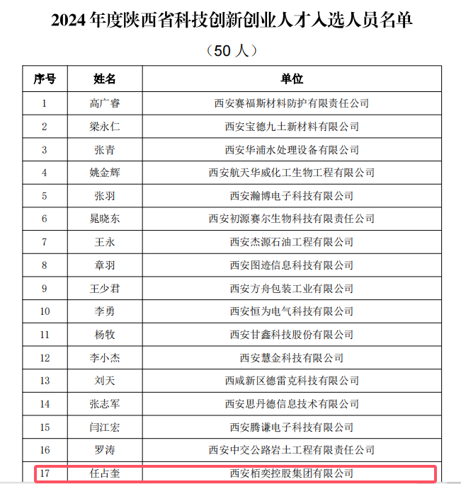近日,陕西省科学技术厅发布了《关于2024年度陕西省中青年科技创新领军人才、科技创新创业人才及2025年度青年科技新星入选人员的通知》,其中,我校校友任占奎入选2024年度陕西省科技创新创业人才。