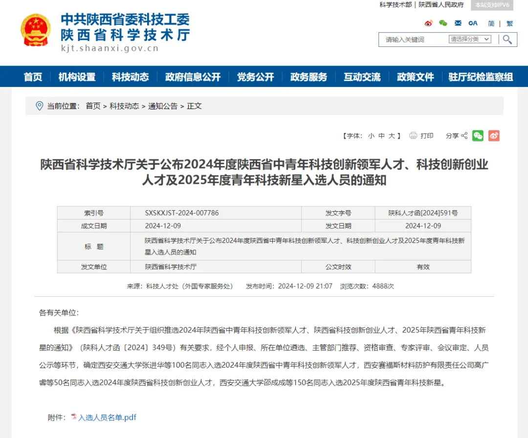 据悉,2024年度陕西省中青年科技创新领军人才、科技创新创业人才以及2025年度青年科技新星的评选工作由陕西省科学技术厅精心组织,历经个人自荐、单位筛选、主管部门推荐、资格复核、专家评审及会议终审等多个严格环节,最终遴选出杰出人才。