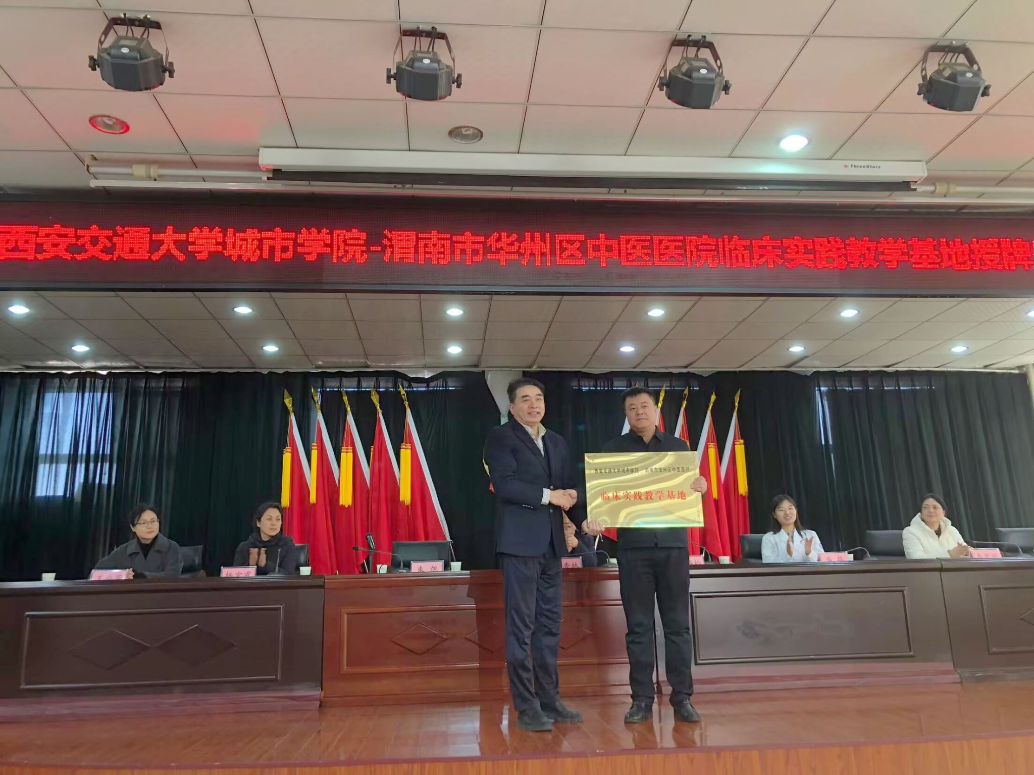 渭南市华州区中医医院党委书记孙香林致辞,他就医院发展概况、学科建设和重点专科进行了简要介绍。孙书记表示,医院见习作为连接理论和临床实践的桥梁,为学生搭建了一个学习与交流的宝贵平台,希望各位学员将医院当成一个温暖的大家庭,以良好的心态适应医院环境,以满腔的热忱投入见习生活,在见习学习中遇到问题要多问、多思、多请教,明确个人目标,锤炼真本领,成为有理想、有抱负、能吃苦、肯奋斗的医学薪火传承人。朱旭副校长与徐海松院长为“西安交通大学城市学院-渭南市华州区中医医院临床实践教学基地”授牌。