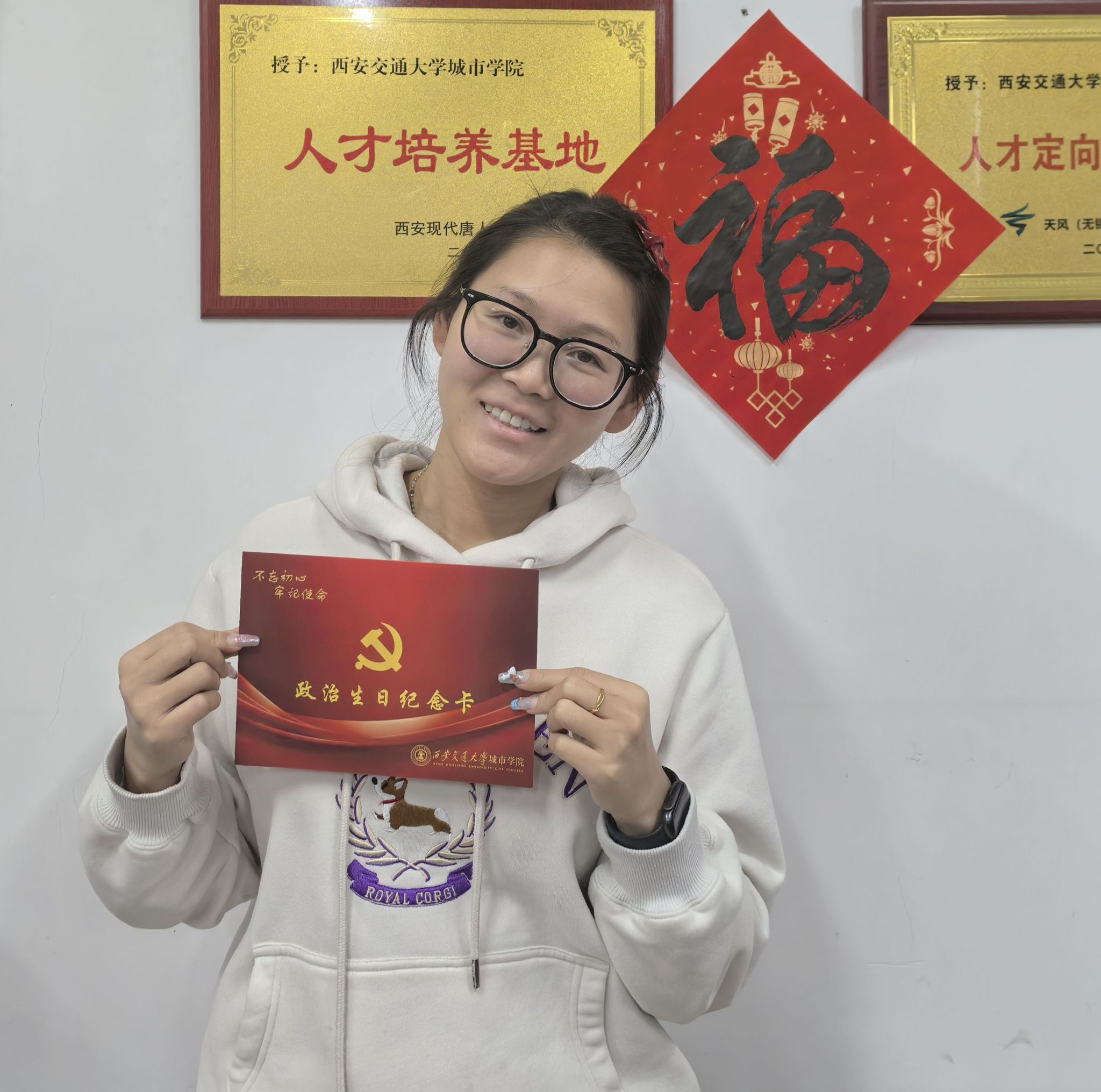 机关第五党支部崔誉文收到“政治生日纪念卡”后表示:“衷心感谢党组织给予的信任与栽培,以及领导和同事们的悉心指导与鼓励。在接下来的工作和生活中,我将不忘初心,砥砺前行,牢记肩负的责任与使命,以更加饱满的热情和坚定的信念,迎接每一个挑战。”