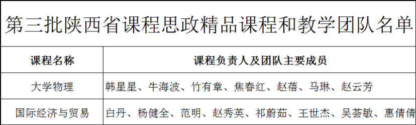 日前,陕西省教育厅公布第三批陕西省课程思政精品课程和教学团队认定名单,我校《大学物理》《国际经济与贸易》2门课程被认定为陕西省课程思政精品课程和教学团队。
