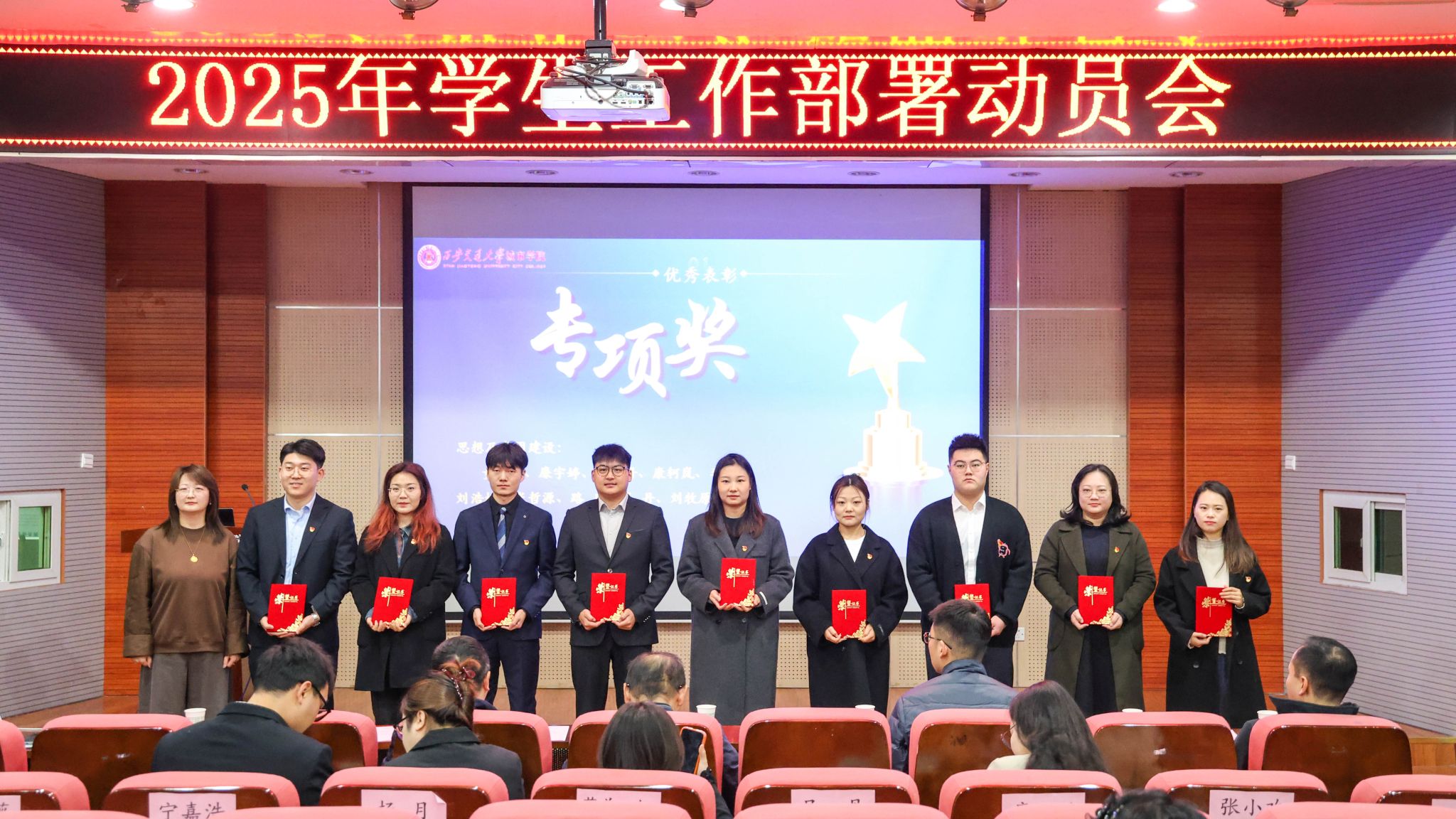 在2025年度学生工作部署环节,党委工作部副部长、校团委书记茹静总结了2024年度团学工作的不足与难点。她表示,团委将以“强基础、抓特色、树品牌”为主线,强化“三力一度”全面推动共青团工作再上新台阶。招生就业处副处长吴昊翔以当前就业数据为参照,通过“同比”“环比”分析当前就业形势,明确2025年就业工作将继续深化校企合作,拓宽就业渠道,优化就业指导服务,助力毕业生实现高质量就业。学生工作处处长辛红伟以“凝心聚力、守正创新,推动学生工作高质量发展”为主题,介绍了2025年学生工作总体部署,他指出,全年学生工作要以《教育强国建设规划纲要(2024-2035)》为指引,紧扣立德树人根本任务,夯实“12357”学生工作体系,提升学生工作的科学化、精准化和智能化水平。要进一步凝心聚力,守正创新,突出重点,培育亮点,聚焦“思政引领、队伍建设、学风提质、心理育人、资助育人、文化浸润、校友联动、安全稳定”八大维度,协同高效推动学生工作高质量发展,构建具有时代性、前瞻性和有温度、有效度的学生工作新格局。