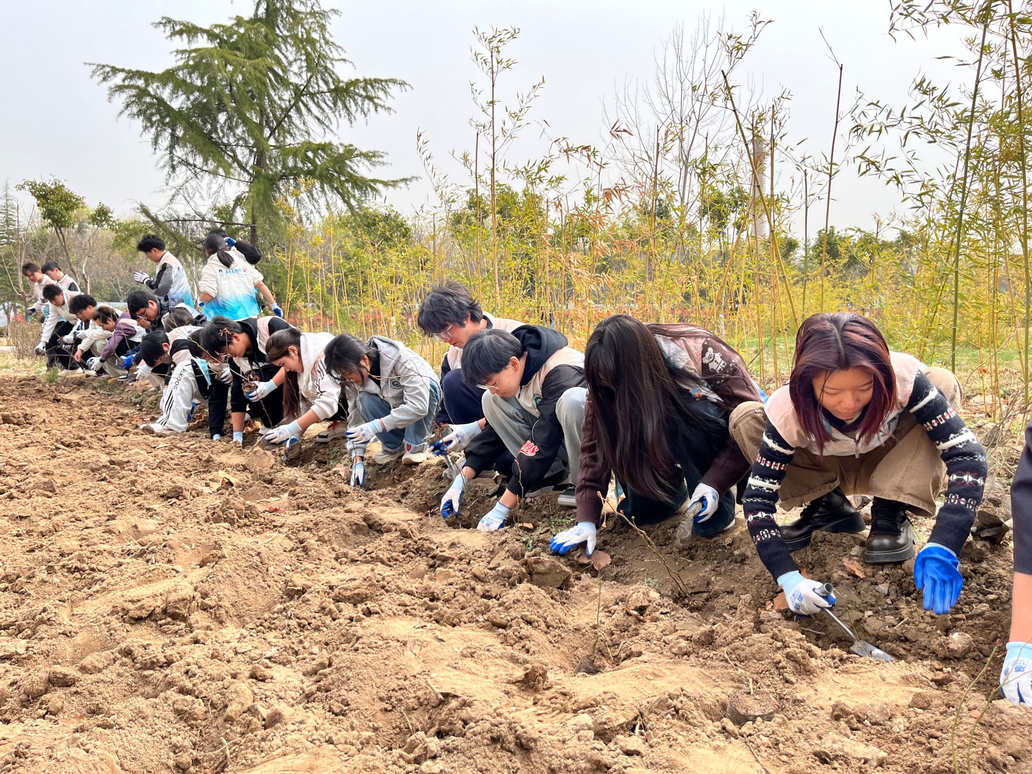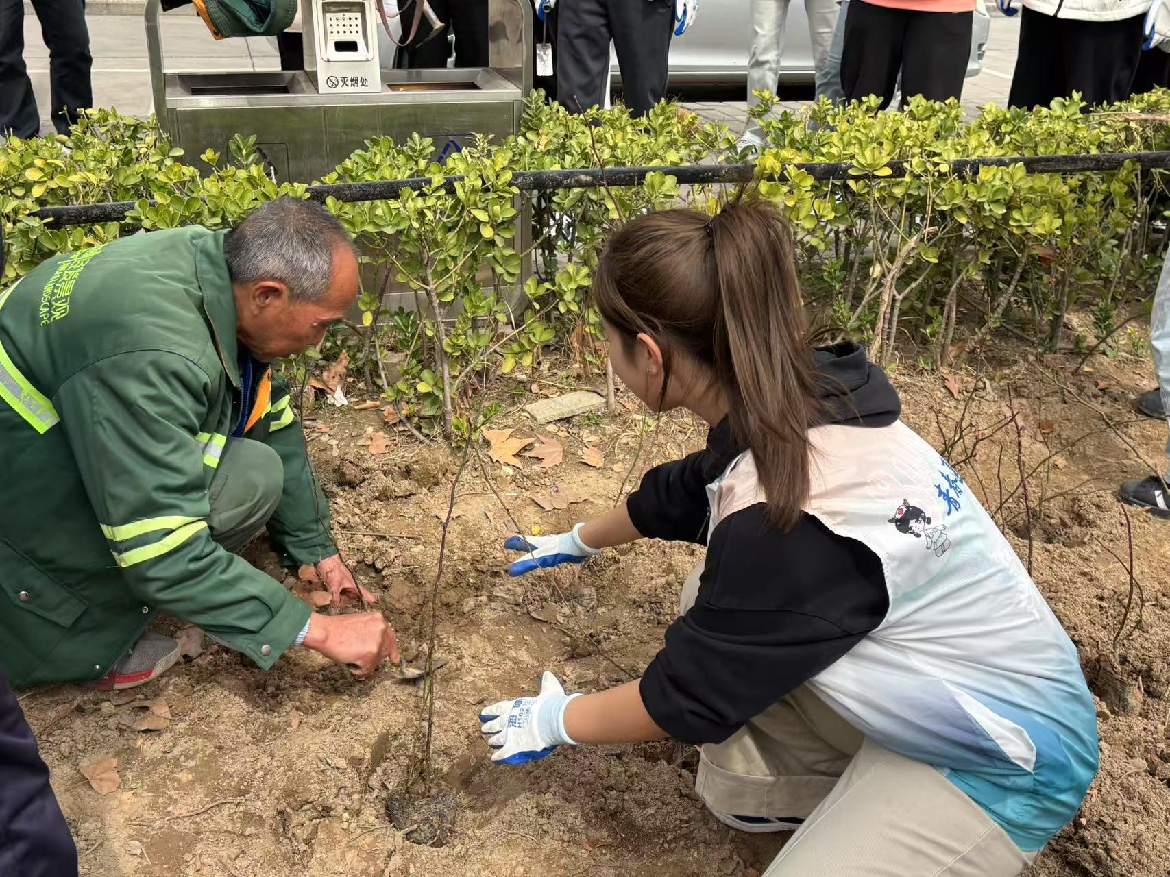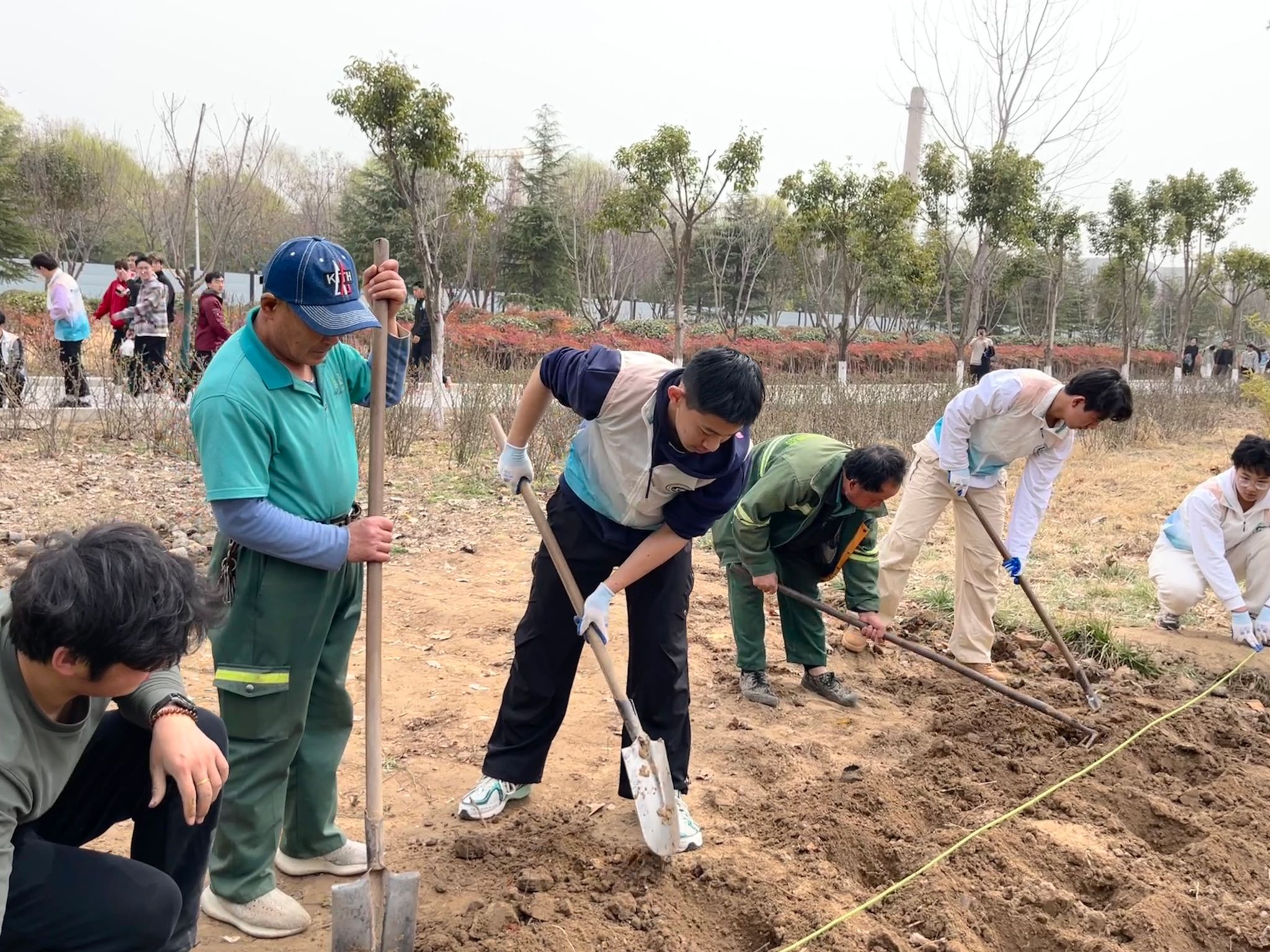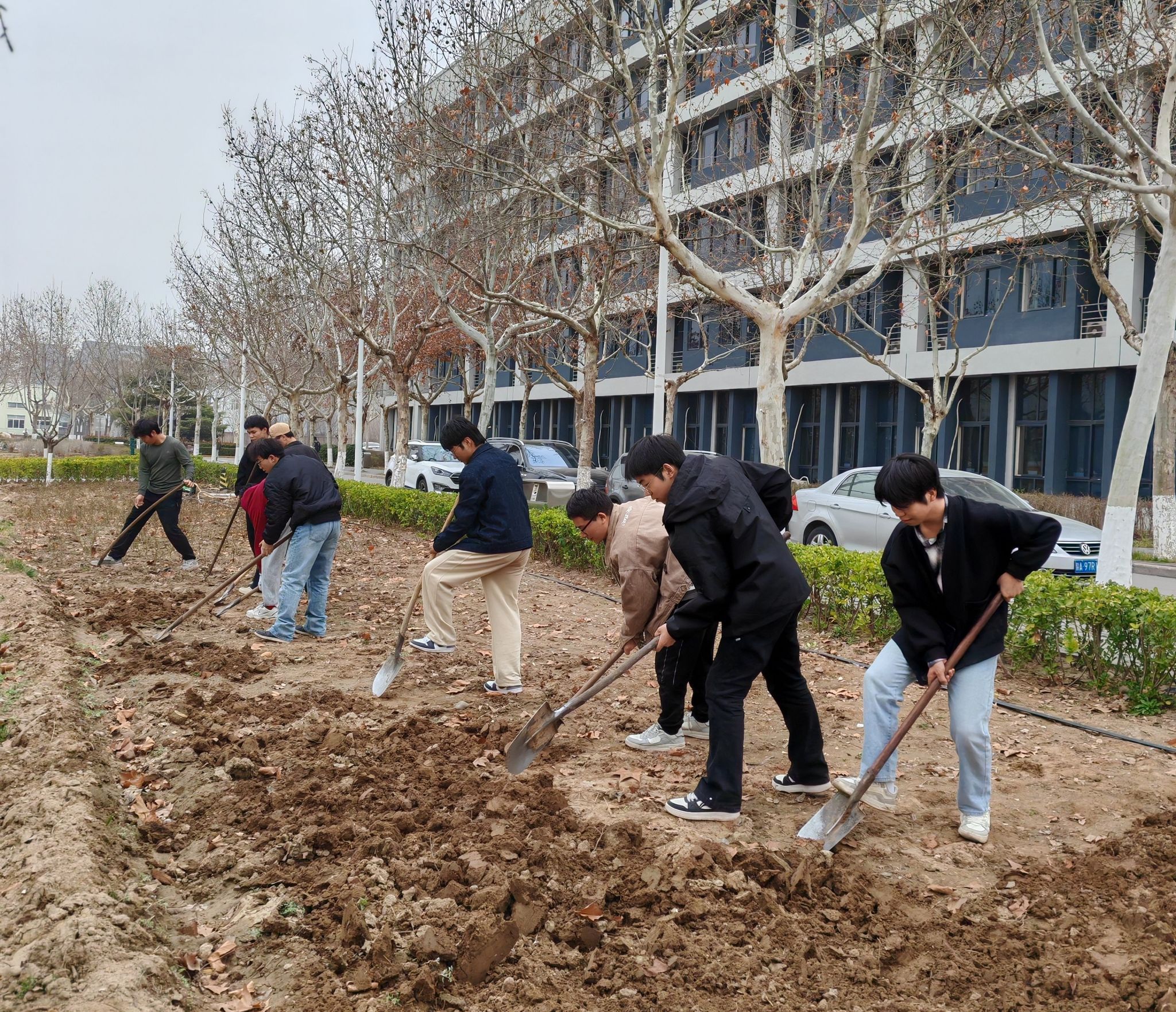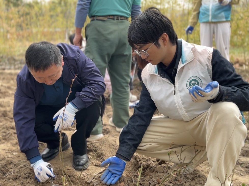 活动现场位于五号楼公寓前的种植区域。前期,学生志愿者们完成了翻土挖坑和种植规划,为种植的顺利开展奠定了基础。