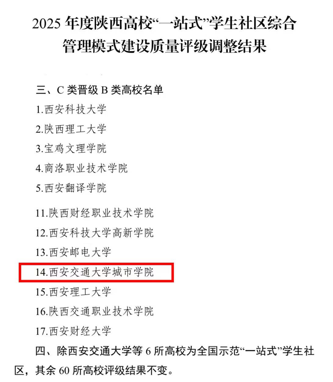近日,中共陕西省委教育工委公布了《2025年度陕西高校“一站式”学生社区综合管理模式建设质量评级调整结果的通知》,西安交通大学城市学院“一站式”学生社区顺利通过省级验收,并成功晋级为B级。这标志着学校“一站式”学生社区建设的相关顶层设计、特色活动、育人成效等获得省委教育工委认可,为进一步深化我校“三全育人”奠定了坚实基础。