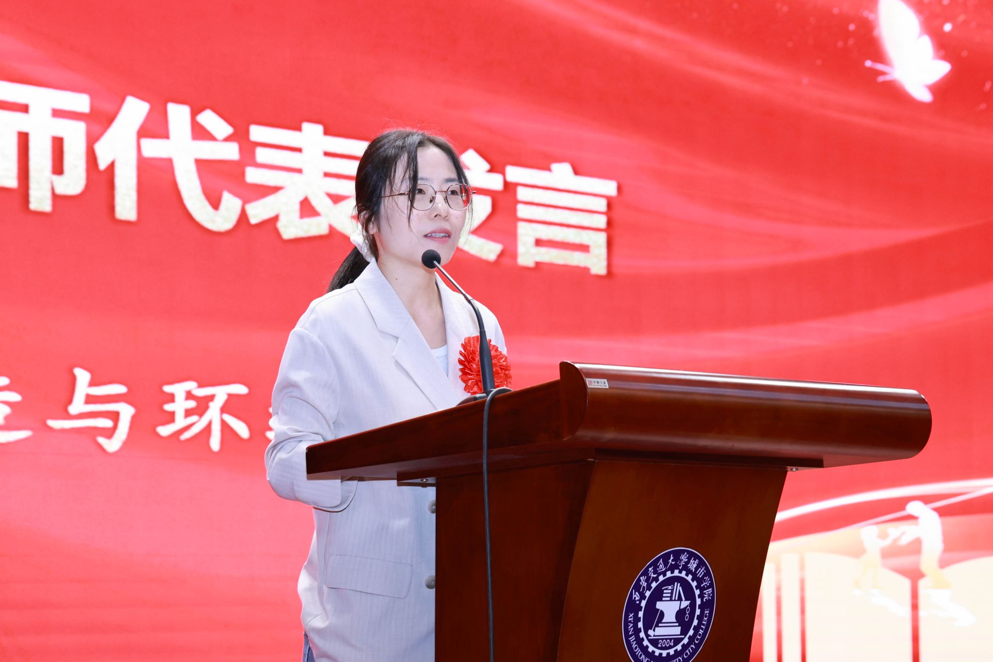 教师代表、智能建造与环境学院李华在发言中表示,学校为教师搭建了广阔平台,提供了有力保障,使每一位教师都能在这里扎根成长、实现价值。她号召广大教师要坚持“立德树人”“探求真理”“启迪智慧”的教育理念,扎根教育沃土,践行育人使命,以更加饱满的热情、更加昂扬的斗志、更加扎实的作风,携手并肩,共同努力,为培养更多担当民族复兴大任的时代新人和实现学校高质量发展贡献力量!