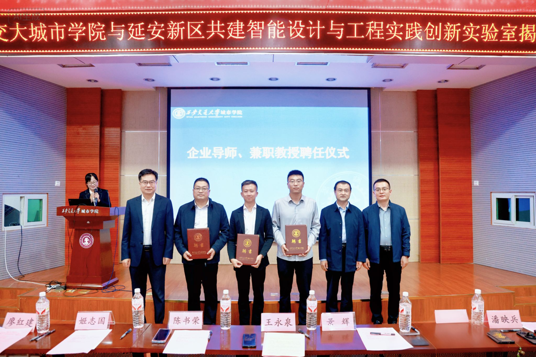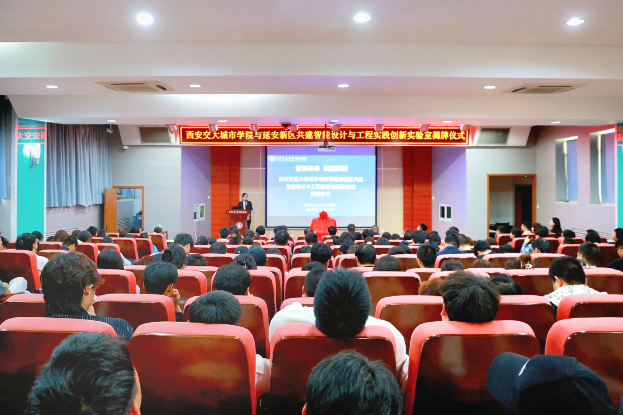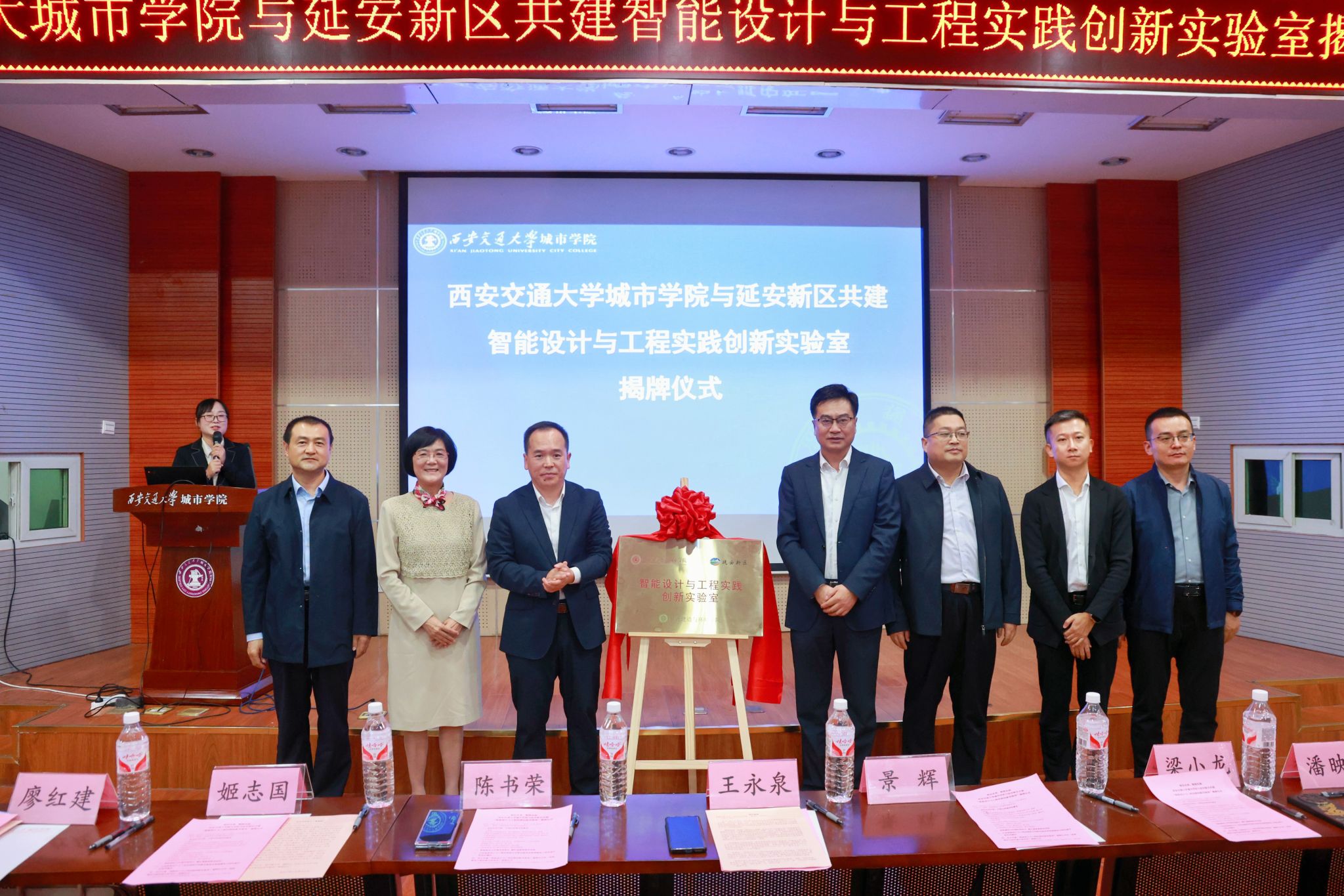 9月24日,西安交通大学城市学院与延安新区共建智能设计与工程实践创新实验室揭牌仪式在F100报告厅举行。延安新区党工委委员、管委会副主任景辉,机械工业勘察设计研究院有限公司延安分公司总经理梁小龙,中国建筑西北设计研究院有限公司教授级高级工程师潘映兵,中建新疆建工西北公司项目经理刘玮,西安交通大学城市学院校长王永泉,党委副书记、副校长陈书荣,校长助理、行政人事部部长姬志国,智能建造与环境学院院长廖红建及师生代表参加活动。活动由智能建造与环境学院副院长黎莹主持。
