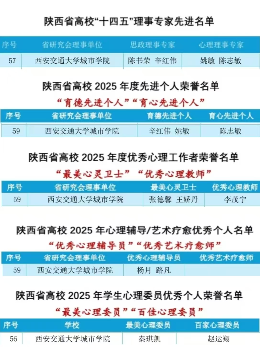 在本次评选中,我校党委副书记、副校长陈书荣,学生工作处处长辛红伟获评陕西省高校“十四五”思政理事专家,学生工作处副处长姚敏、心理中心教师陈志敏获评心理理事专家。同时,辛红伟、姚敏获“育德先进个人”称号,陈志敏获“育心先进个人”称号;辅导员王娇丹、张德馨获“最美心灵卫士”称号;通识教育学院李茂宁被评为优秀心理教师;辅导员杨月、路凡获评优秀心理辅导员。艺术学院环境设计2402班秦琪凯同学获“最美心理委员”称号,经济与管理学院会计2401班赵运翔同学获评“百佳心理委员”。