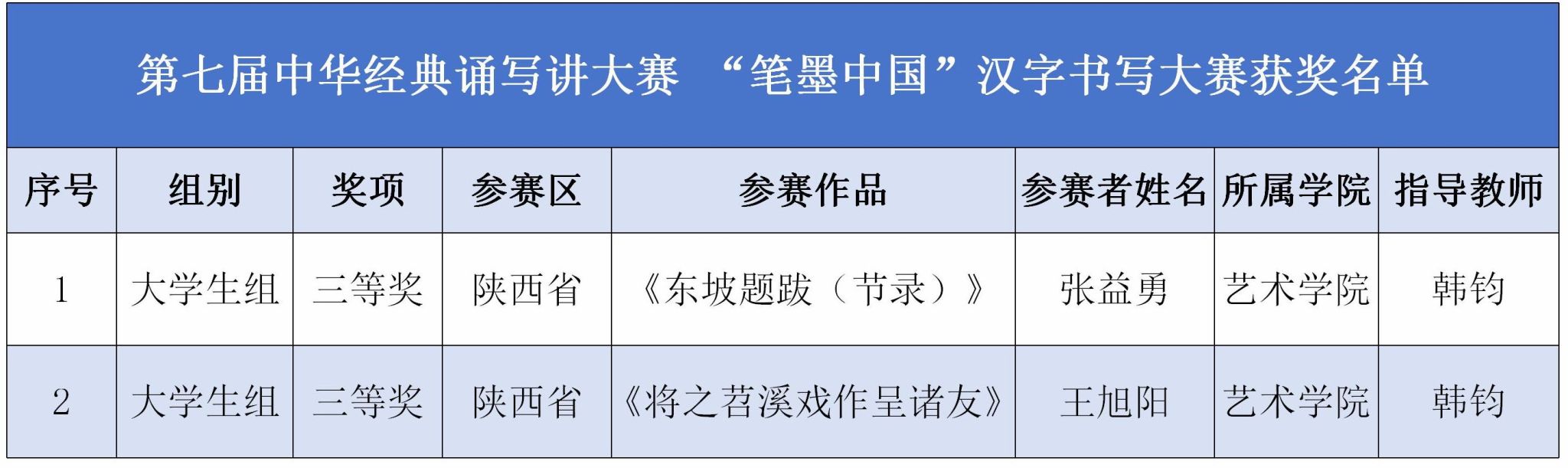 近日,由教育部主办的全国第七届中华经典诵写讲大赛国奖获奖结果正式揭晓。我校在经典书写大赛大学生毛笔组中获三等奖两项。