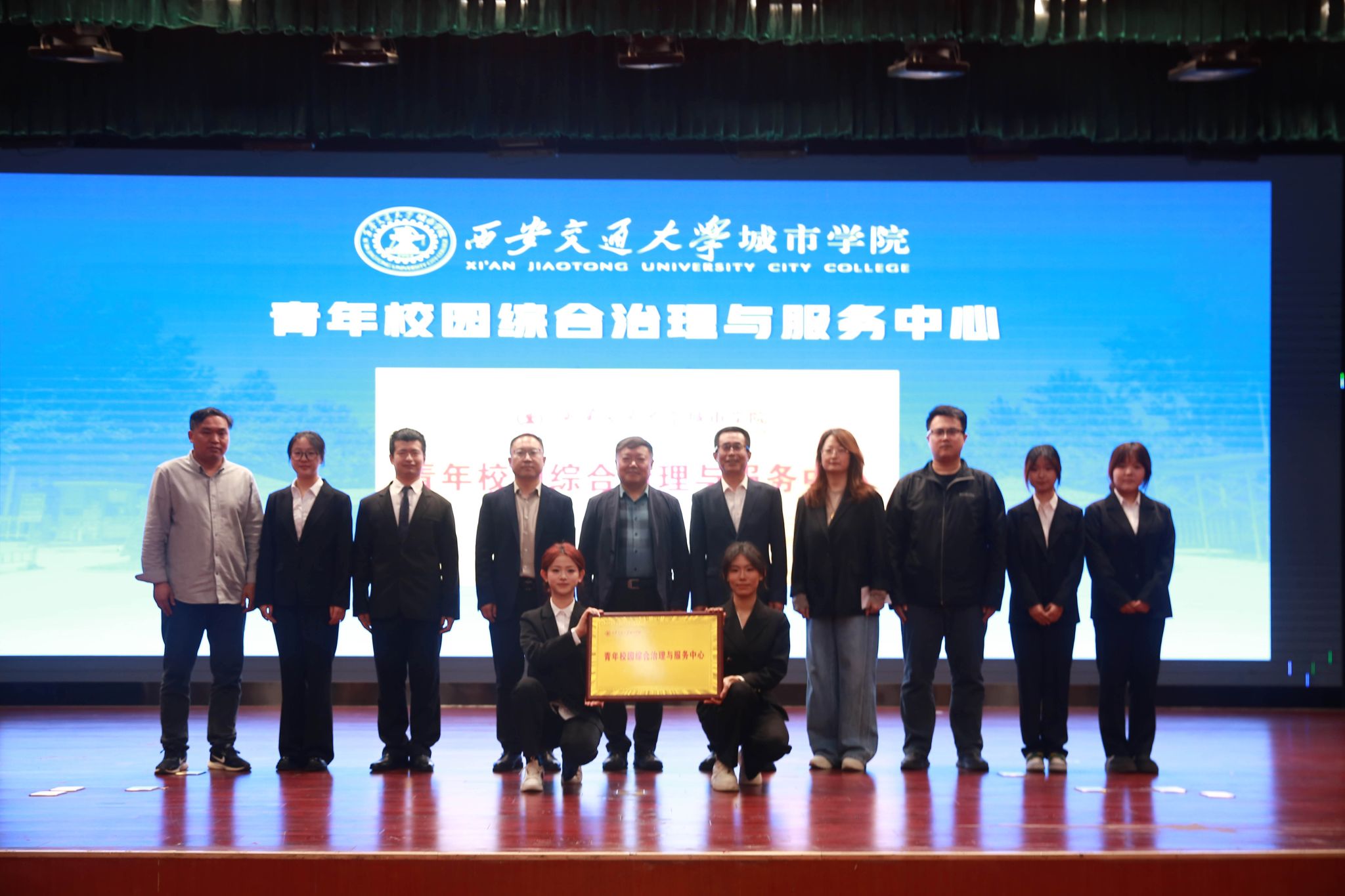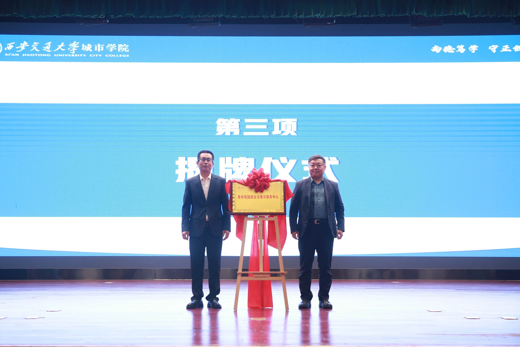严红昌与岳华海共同为中心揭牌,标志着西安交通大学城市学院青年校园综合治理与服务中心正式成立,校园治理与服务育人工作迈入新阶段。