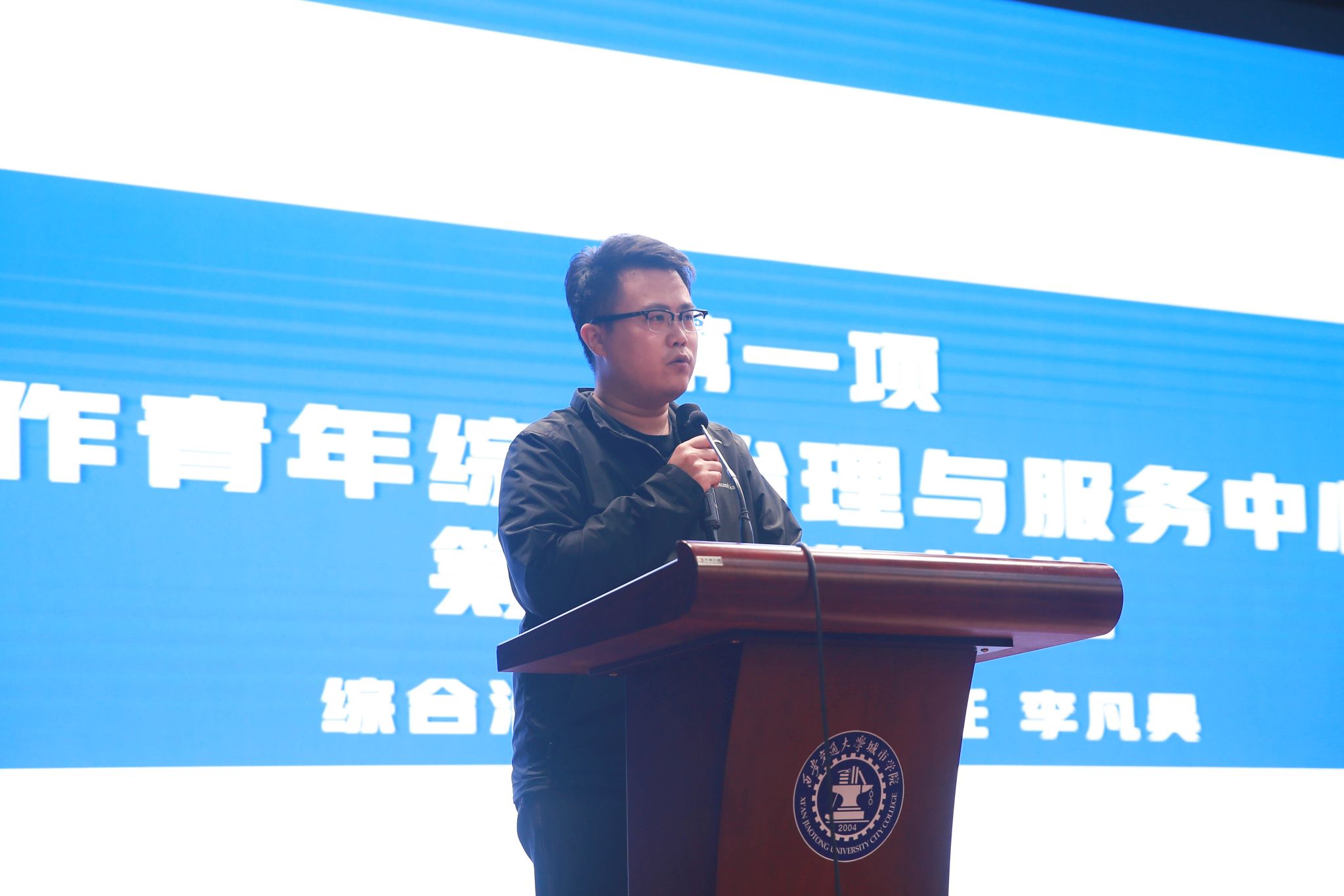 保卫处处长李凡昊作筹备工作报告。他全面介绍了青年校园综合治理与服务中心(以下简称中心)筹备历程、组织架构、运行机制及未来工作方向。中心以学生为主体,致力于搭建学生自治平台,畅通诉求表达渠道,推动校园治理从“学校管理”向“师生共治、学生主导”转变。