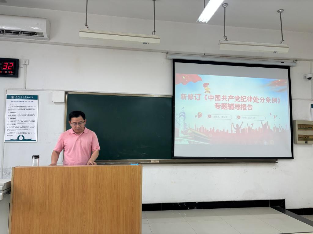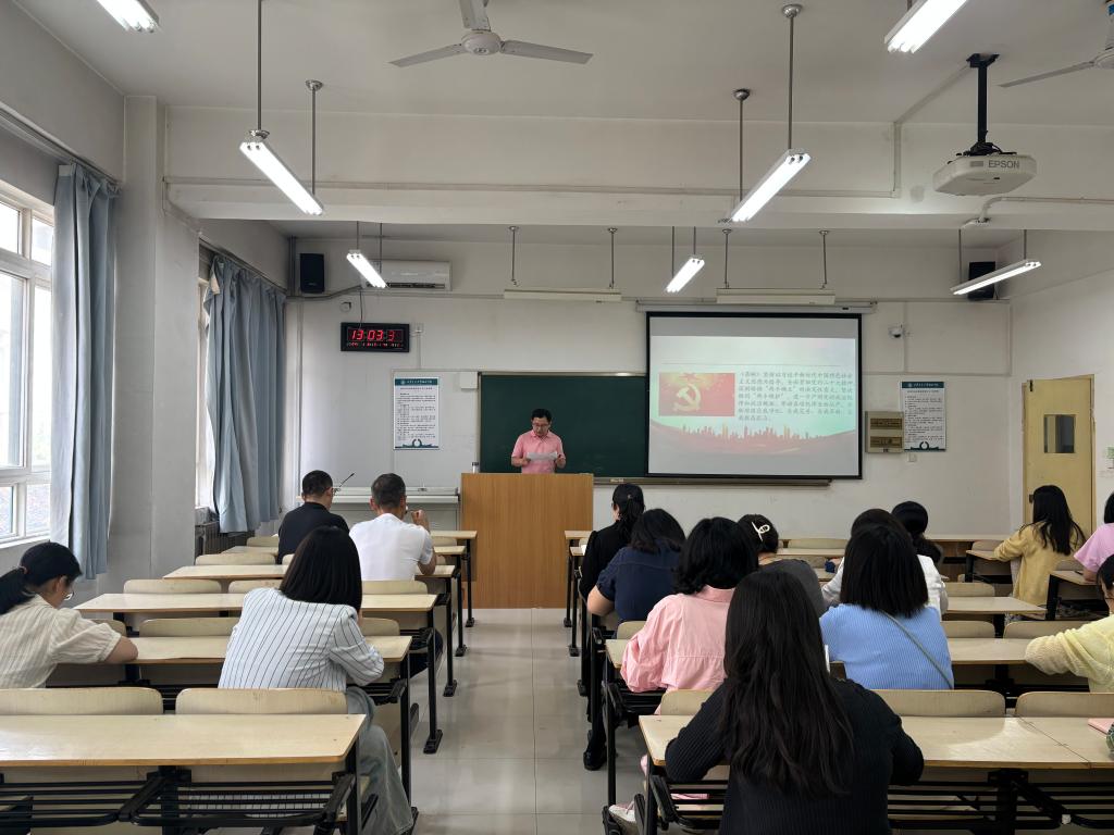 为深入开展党纪学习教育,加强党的纪律建设、增强党员的政治觉悟和纪律意识,5月8日下午,外国语学院教工党支部在教学楼B316开展支部书记讲党课活动,支部书记袁长普为全体党员讲授主题教育专题党课,学习贯彻新修订的《中国共产党纪律处分条例》。
