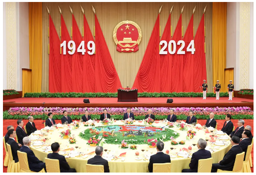人民大会堂宴会厅华灯璀璨,洋溢着喜庆热烈的节日氛围。主席台上方高悬着庄严的国徽,“1949-2024”大字年号在鲜艳红旗映衬下格外醒目。